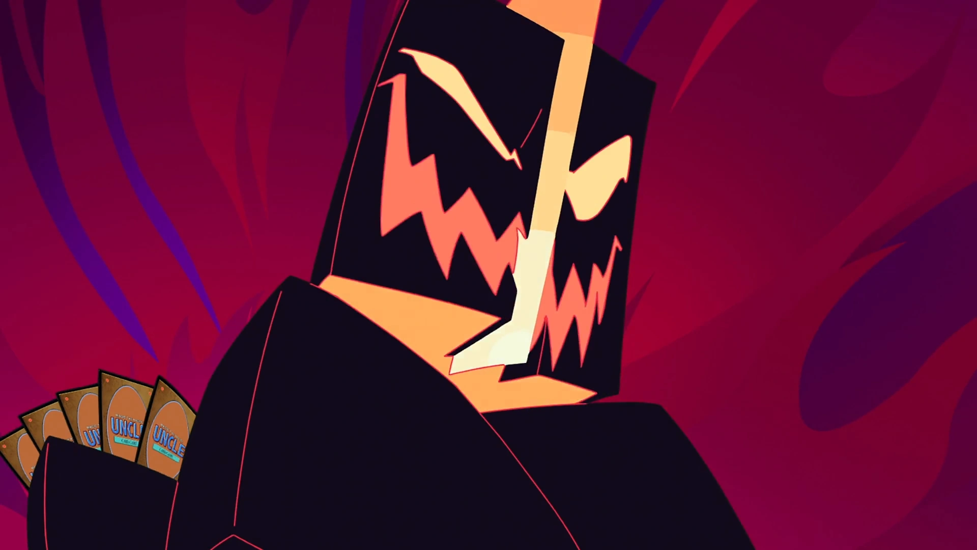 This ghost has the appearance of a giant blocky hand. It's head was composed of it's index and middle finger with a card between them. It's face is similar to that of a Jack-o'-lantern.